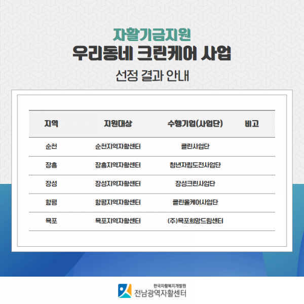 전남광역자활센터에서는 지역자활센터 청소업종사업단 및 자활기업 대상으로 '우리동네 크린케어 사업' 신청접수를 2021년 4월 29일부터 5월 21일까지 진행하였다. 총 8개소가 신청하였으며 선정위원회를 통해 5개소를 선정하었다. 전남광역자활센터는 '우리동네 크린케어사업'을 통해 전남 청소업종 사업단과 자활기업의 청소 근로 역량을 효과적으로 실현하고 동반성장 해나갈 수 있는 체계를 마련하는데 지속적으로 노력할 계획이다.